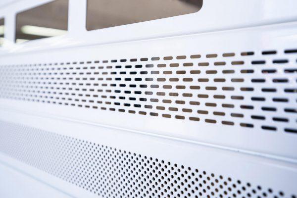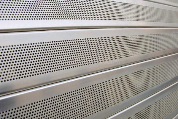 Lama recta monopared de aluminio extrusionado de 100 x 17 x 2 mm de espesor (taladrado de 3 mm). Tapones laterales de nylon de alta resistencia. Permite visualizar el interior del local ofreciendo la misma seguridad del Alucorp ciego.